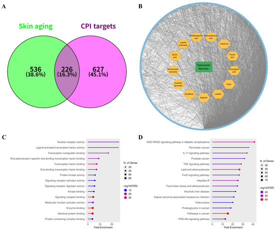 - Chen, W.; Deng, Q.; Deng, B.; Li, Y.; Fan, G.; Yang, F.; Han, W.; Xu, J.; Chen, X. Comprehensive analysis of Hibisci mutabilis Folium extract’s mechanisms in alleviating UV-induced skin photoaging through enhanced network pharmacology and experimental validation. Front. Pharmacol. 2024, 15, 1431391. [Google Scholar] [CrossRef]