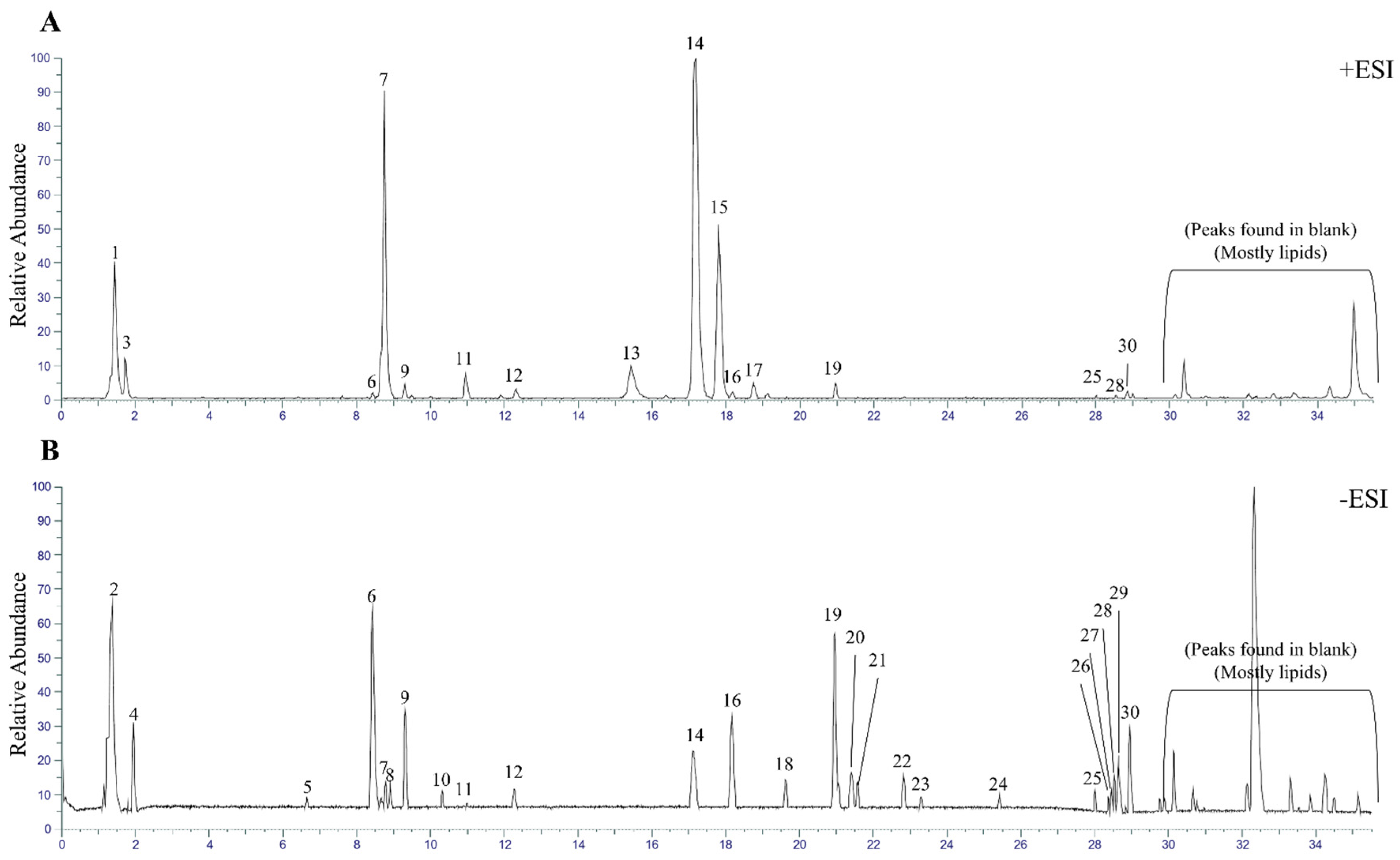 2.2. UHPLC–MS/MS Analysis and Metabolite Identification