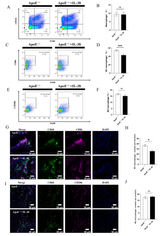 3.3. IL-38 Mitigates Systemic and Atherosclerotic Lesion Inflammation and Decreases M1-like Macrophage Polarization