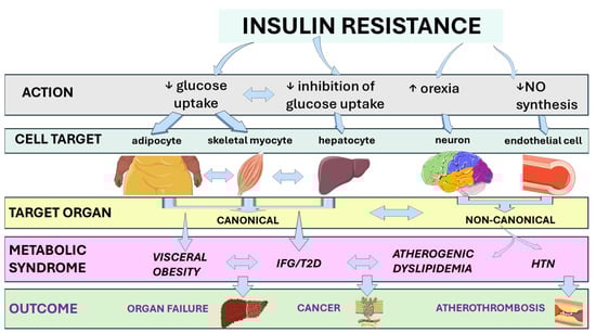 Over the past few decades, research has expanded the understanding of IR beyond type 2 diabetes (T2D) and metabolic syndrome. It now highlights that IR plays a crucial role as a strategic intersection among various seemingly unrelated conditions. Complex pathophysiological systemic mechanisms, such as cell stress, mitochondrial dysfunction, and chronic subclinical low-grade inflammation, often exacerbated by factors like obesity, are intricately linked with IR. This, in turn, increases the risk of cardiovascular disease (CVD), organ failure, and various cancer types by triggering a vicious cycle where each metabolic dysfunction worsens and perpetuates other features of the metabolic syndrome over time [14,15,16,17].