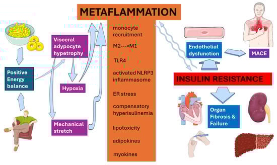 - Crasan, I.-M.; Tanase, M.; Delia, C.E.; Gradisteanu-Pircalabioru, G.; Cimpean, A.; Ionica, E. Metaflammation’s Role in Systemic Dysfunction in Obesity: A Comprehensive Review. Int. J. Mol. Sci. 2025, 26, 10445. [Google Scholar] [CrossRef]