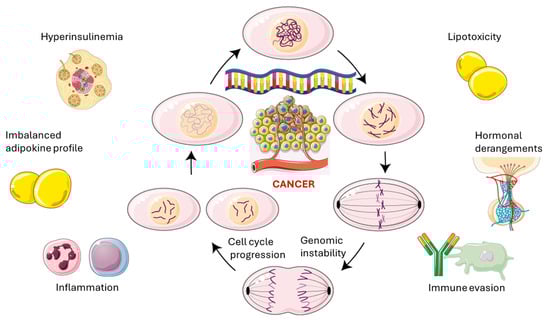 The self-reinforcing oncogenic cycle. Secondary hyperinsulinemia occurs within the context of and contributes to propagating genomic instability and cell cycle progression. This occurs alongside lipotoxicity, hormonal and adipokine imbalances, immune evasion and chronic inflammation. This original illustration was created using Servier Medical ART (SMART) and is based on references cited in the text. It is licensed under the Creative Commons Attribution 4.0 International License (CC BY 4.0).