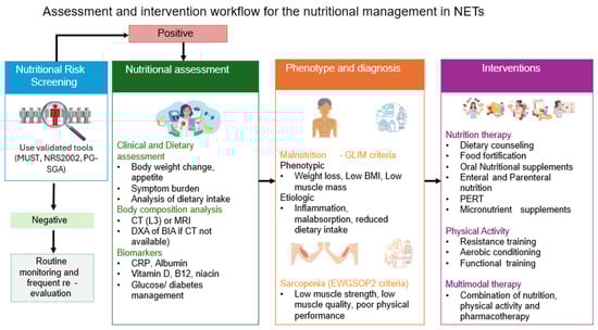 Multimodal interventions combine nutrition, exercise, and anti-inflammatory treatment to treat cancer cachexia and sarcopenia efficiently. This type of intervention has been described in mixed cancer Randomized Controlled Studies (RCTs), such as the Multimodal-Exercise, Nutrition and Anti-inflammatory medication for Cachexia (MENAC) trial. Based on the rationale of this trial, the effects of the combination of interventions aim to improve muscle mass, functionality, nutritional status, and treatment tolerance [62]. It should be stressed, though that studies on patients with NETs remain limited. Therefore, the application of this type of intervention in patients with NETs should be adopted to tumor-specific factors, including the chronicity of symptoms and the hormonal syndromes, and should be applied by a multidisciplinary team of oncologists, endocrinologists, surgeons, gastroenterologists, nutritionists, nurses, psychologists, physiotherapists, and exercise specialists [17]. The steps of nutrition screening, assessment, and intervention are summarized in Figure 2.
