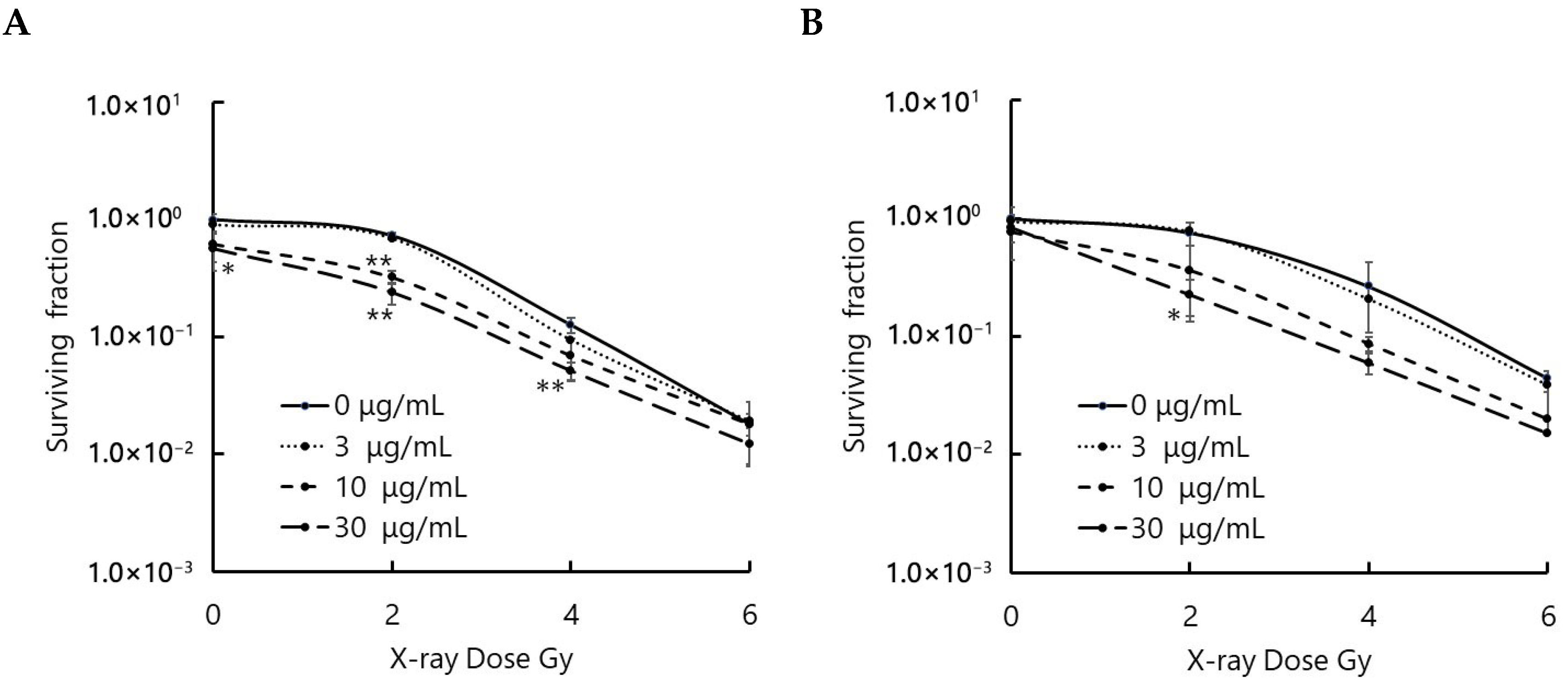 Cells were incubated in complete medium supplemented with 0, 3, 10, or 30 μg/mL talaporfin for 4 h under dark conditions, followed by washing with PBS. Afterward, the medium was replaced with fresh culture medium, and the cells were irradiated at a rate of 1 Gy/min. Following exposure to 0, 2, 4, or 6 Gy of X-ray irradiation, the cells were transferred into 25-cm2 flasks at a density of 1000 cells per flask and maintained at 37 °C in a 5% CO2 atmosphere. Cell survival was assessed using a clonogenic assay. Colonies were fixed and stained with 2% crystal violet in methanol after a minimum of 14 days of incubation. Only colonies consisting of more than 50 cells were counted as viable.