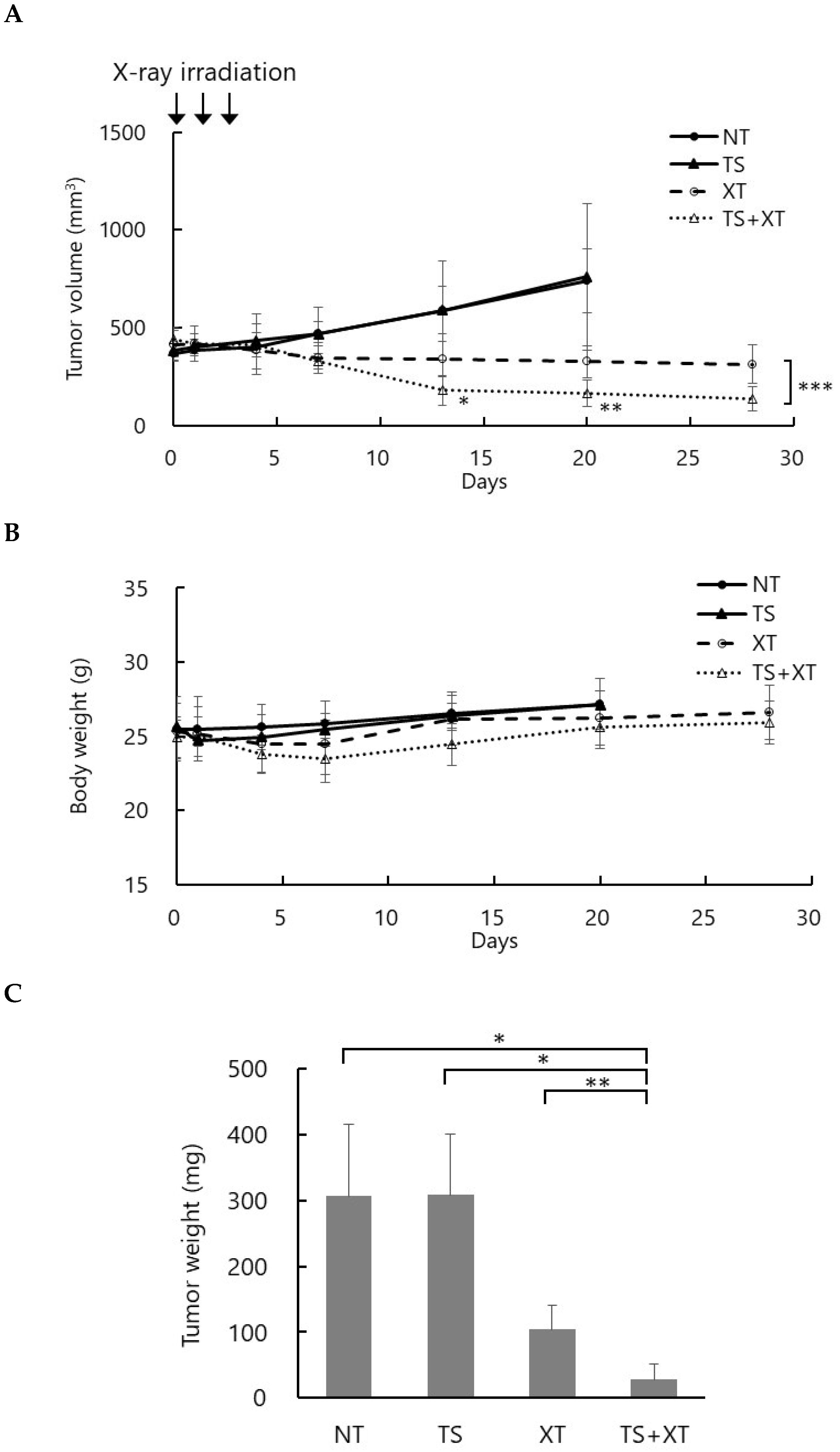 Figure 4A). Both the XT and TS-XT groups exhibited a transient decrease in body weight following irradiation; however, body weight subsequently recovered, and no significant difference was observed among the groups (