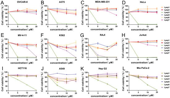 The trends of inhibition rates of 6 candidate peptides against 12 human-derived cancer cell lines at 5 μM, 10 μM, and 20 μM. The tested cell lines include human solid tumors: (A) OVCAR-8; (B) A375; (C) MDA-MB-231; (D) HeLa; and human hematological tumors: (E) MV-4-11; (F) K562; (G) Raji; and (H) Jurkat. (I) HCT116; (J) A549; (K) Hep G2; (L) Mia Paca-2. Each subgraph corresponds to one cancer cell line, with the x-axis representing peptide concentrations and the y-axis representing cell viability rates (%). Different lines indicate different candidate peptides, as labeled in the legend. Data points represent the mean of 3 independent experiments, with error bars indicating the standard error of the mean (S.E.M.).