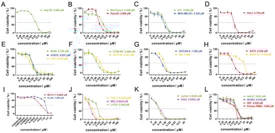 Lpep3 exhibits a potent and selective cytotoxic activity against leukemia cells. The IC50 values of Lpep3 in various cancer cell lines grouped by tissue type. (A) Hepatocellular carcinoma cells (HepG2); (B) pancreatic cancer cells (MIA PaCa-2, PANC02); (C) breast cancer cells (4T1, MDA-MB-231); (D) cervical cancer cells (HeLa); (E) lung cancer cells (A549, H1975, LLC); (F) colorectal cancer cells (HCT116, CT26.WT); (G) ovarian cancer cells (ID8, OVCAR8); (H) melanoma cells (B16-F10, A375). (I–K) Human hematological tumors (MV-4-11, HL-60, YAC-1, MEL, L1210, K562, and Jurkat). (L) Non-cancer cell line and primary PBMCs. Each data point represents the IC50 value (μM) calculated from three independent experiments (concentration–response curves), with error bars indicating the standard error of the mean (S.E.M.). IC50 values were derived using nonlinear regression analysis of dose–response curves (log (inhibitor) vs. normalized response).