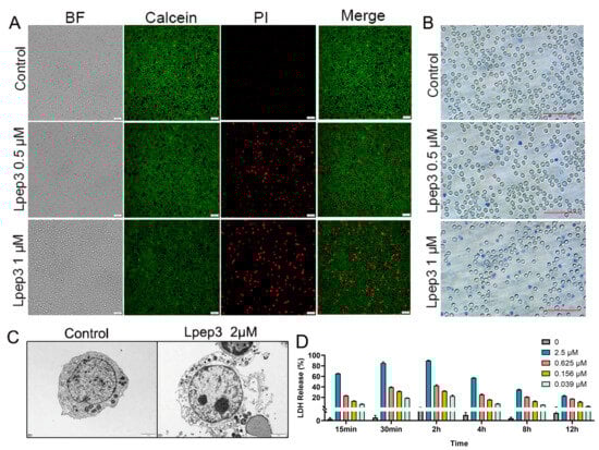 The membrane disruption ability of Lpep3. (A) Calcein-AM/PI double staining after MV-4-11 cells were treated with Lpep3 at 0.5 and 1 µM for 24 h. Scale bar is 50 μM. (B) Trypan blue staining. Scale bar is 100 μM. (C) TEM images of MV-4-11 cells after treatment with 2 µM Lpep3 for 1 h. Scale bar is 5 μM. (D) Measurement of LDH leakage after MV-4-11 cells were treated with Lpep3 at different concentrations for 15 min, 30 min, and 2 h.