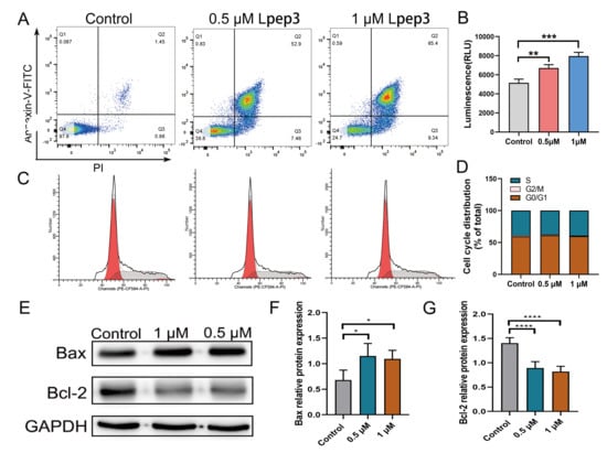 For the cell apoptosis assay, MV-4-11 cells were treated with 0.5 and 1 µM Lpep3 for 24 h; no drug treatment was viewed as the control. According to the Annexin V-EGFP/PI kit’s instructions (Keygene Biotech, Nanjing, China), cells were harvested and stained with 5 µL Annexin V–FITC, 5 µL PI, and incubation buffer for 15 min at 37 °C. They were then subjected to flow cytometry to analyze the percentage of apoptotic cells. For the cell cycle assay, cells were treated with the same concentration for 24 h. After that, a total of 3 × 105 cells was collected and fixed in cold 70% ethanol. The plates were finally stained with PI (propidium iodide, 1 mg/mL), TritonX-100 (0.1%), and RNAse (100 mg/mL) and incubated at 37 °C for 20 min in a dark environment. A flow cytometer was employed to identify fluorescence signals. Cell cycle distribution was then determined by flow cytometry (Beckman Coulter, Fullerton, CA, USA).