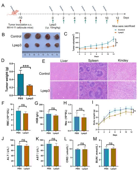 In vivo antitumor activity and safety evaluation of Lpep3. (A) Schematic illustration of the schedule for the in vivo therapeutic experiments. (B) Images of excised MV-4-11 tumors in nude mice (n = 4). (C) Growth curves of MV-4-11 tumor formation. (D) Quantitative results of tumor weight. (E) HE staining between PBS and Lpep3 groups. (F–H) Data from blood routine examination parameters RBC, HGB, and Neu. (J–M) The liver and kidney function tests of mice treated with PBS or Lpep3 for 12 days. (I) Changes in body weight of BALB/c mice during the study. RBC, red blood cell; Neu, neutrophil count; HGB, hemoglobin; ALT, alanine aminotransferase; AST, aspartate aminotransferase; CRE, creatinine. Data are expressed as mean ± S.E.M., n = 4 for each group. Statistical analysis was performed using the t-test. * p < 0.05, *** p < 0.01; ns indicates no significant difference (between the two groups).