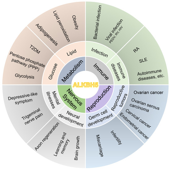ALKBH5 is involved in various diseases. ALKBH5 exerts critical roles in glucolipid metabolism, bacterial and viral infection, RA, SLE, reproductive system cancers, infertility, and miscarriage. In addition, ALKBH5 takes part in neurological disorders, such as brain damage and depression. (This picture was created with PowerPoint version 16051.18227.20162.0.)