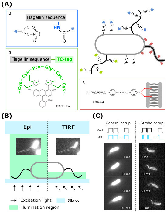 - Zhuang, X.Y.; Guo, S.; Li, Z.; Zhao, Z.; Kojima, S.; Homma, M.; Wang, P.; Lo, C.J.; Bai, F. Live-cell fluorescence imaging reveals dynamic production and loss of bacterial flagella. Mol. Microbiol. 2020, 114, 279–291. [Google Scholar] [CrossRef]