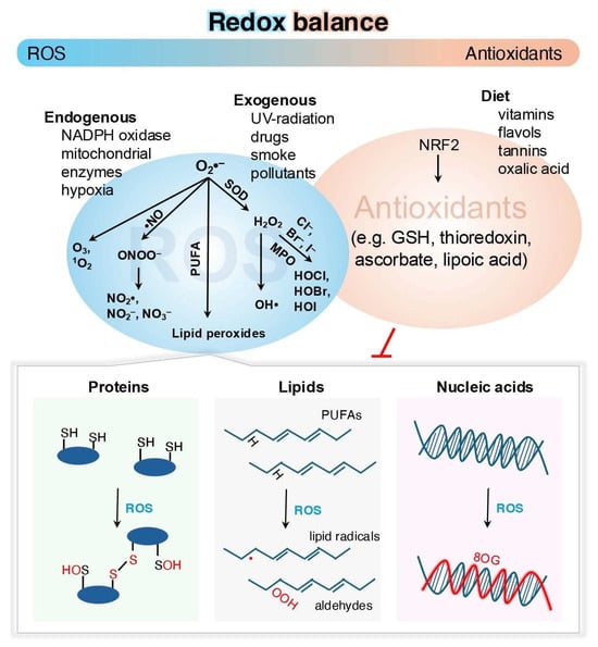 Redox balance and regulation. ROS are generated under the influence of external factors (e.g., UV radiation, pollutants) and internally by enzymes like nicotinamide adenine dinucleotide phosphate (NADPH) oxidases as well as mitochondrial respiration. ROS can modify cellular macromolecules such as proteins, lipids, or nucleic acids. Protein oxidation typically involves cysteine residues (P-SH) forming sulfenyl groups (P-SOH), which are groups that may react further to form disulfides or other modifications. Lipid peroxidation of poly-unsaturated fatty acids (PUFAs) generates lipid radicals and carcinogenic aldehydes like 4-hydroxy-2-nonenal (HNE). Oxidation of nucleic acid bases, particularly guanine to 8-hydroxy-20-deoxyguanosine (8OG), can lead to DNA damage. The body regulates ROS via enzymatic and non-enzymatic mechanisms, involving a diverse range of enzymes and LMW antioxidants (e.g., GSH and vitamins), which neutralize ROS and maintain redox homeostasis. Antioxidants are largely replenished through dietary intake. NRF2, nuclear factor erythroid 2-related factor 2; MPO, myeloperoxidase.