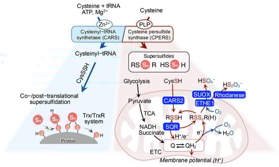 One such mechanism involves cysteinyl-tRNA synthetase (CARS), an enzyme canonically known for catalyzing the synthesis of cysteinyl-tRNA [41]. Two isoforms of this enzyme exist in mammalian cells: cytosolic CARS1 and mitochondrial CARS2, both of which have been identified as novel cysteine persulfide synthase (CPERS), possessing conserved cysteine persulfide-synthesizing activity across species [27,42] (Figure 3). Studies with recombinant CARS have demonstrated that mouse CARS1, human CARS2, and Escherichia coli CARS can produce CysSSH in the presence of the substrate L-cysteine [27]. Furthermore, mass spectrometry-based analyses have shown a significant reduction in supersulfide levels in CARS2 knockout cells. A similar study revealed that heterozygous knockout mice for CARS2 exhibited significantly lower levels of LMW supersulfides compared to wild-type mice [27].