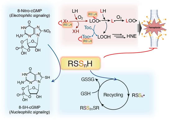 Another example of the regulation of oxidative distress by supersulfides is revealed in its direct reaction with endogenous electrophiles, including 8-nitroguanosine 3′,5′-cyclic monophosphate (8-nitro-cGMP), an important secondary messenger in redox signaling [26,61,62]. Sawa et al. demonstrated the conversion of 8-nitro-cGMP to 8-mercapt-cGMP, a biologically active metabolite in vivo, by supersulfides [62]. Other endogenous electrophiles, such as nitrated fatty acids, prostaglandin J2 and HNE, exhibit similar reactions, suggesting the key role that supersulfides play in detoxification of electrophiles [63,64,65].