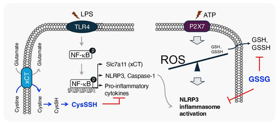 Macrophages, which lack the cystine transporter xCT showed significantly lower levels of supersulfides after LPS stimulation when compared to wild-type macrophages [80]. Under the same conditions, the unavailability of the cystine substrate for supersulfide generation promoted pro-inflammatory gene expression in macrophages. This indicates that supersulfides form a negative feedback loop in the inflammation process [80]. Moreover, it was also shown that under pathological conditions, the NACHT, LRR, and PYD domains-containing protein 3 (NLRP3) inflammasome, a key mediator of acute inflammation, triggers a cytokine storm [83]. Although ROS are believed to be necessary for NLRP3 inflammasome activation, the detailed molecular mechanism of its role remains unclear [84]. Zhang et al. demonstrated that intracellular GSH and its supersulfides, including GSSH and GSSSH, are excreted from macrophages, causing the generation of ROS and subsequent NLRP3 inflammasome activation [78]. The extracellular addition of GSH suppressed the efflux of GSH and its derived supersulfides, causing a significant suppression of NLRP3 inflammasome activation [78]. The anti-inflammatory effects of supersulfides have, therefore, been strongly highlighted by these findings (Figure 6).
