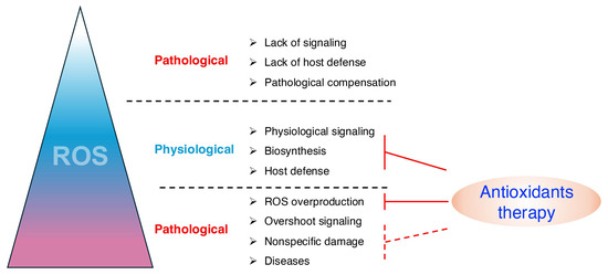 A significant challenge in the usage of antioxidants is that ROS plays complex biological roles, including essential physiological functions. Scavenging ROS indiscriminately can, in many cases, exacerbate the pathology (Figure 7). For example, in animals, a brief period of cardiac ischemia–reperfusion generates OH•, impairing contractile function during reoxygenation. Although scavenging ROS improves contractile function, it also prevents the adaptation of cardiac function to repeated brief periods of ischemia [91]. Patients with chronic inflammation suffering from severe infections often rely on ROS to help kill pathogens through inducing inflammation [92]; therefore, effective antioxidant therapies may give rise to side effects, including increased susceptibility to infections and disruption of ROS-dependent inflammatory signaling.