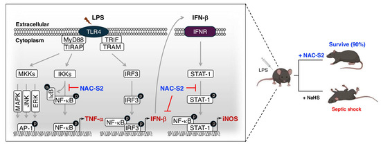 Therapeutic potential of supersulfides in sepsis. During LPS-induced sepsis, TLR4 signal transduction is initiated via the TIRAP-MyD88 and TRAM-TRIF pathways, leading to the expression of inflammatory mediators, including TNF-α, IFN-β, and iNOS, through the phosphorylation of NF-κB, IRF3, and STAT-1, respectively. Enhancement of cellular supersulfide levels by NAC-S2 potently inhibits the phosphorylation of these proteins, thereby suppressing the downstream inflammatory responses and protecting the mice from septic shock.