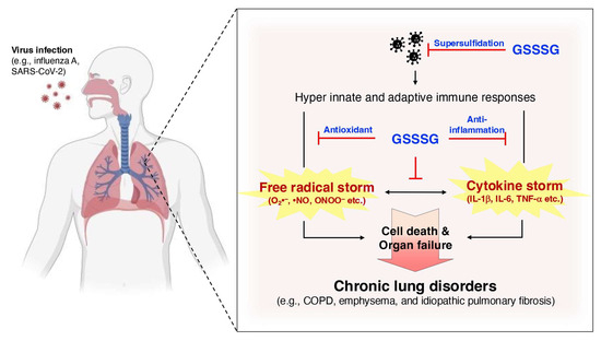 Protective roles of GSSSG in COPD. COPD, often triggered by viral infections such as influenza and SARS-CoV-2, is characterized by cytokine and radical storms in the lungs. The interplay between these storms exacerbates severe inflammation and oxidative distress. Endogenously derived or exogenously administrated GSSSG provides multi-faceted protection by inhibiting inflammatory responses, suppressing radical generation, and reducing viral infectivity and replication.
