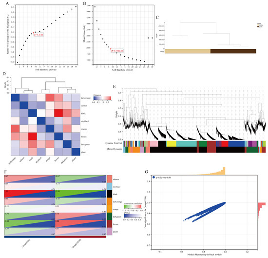 In accordance with the principles of scale independence (Figure 3A) and average connectivity (Figure 3B), we established the threshold for soft power. Furthermore, based on the clustering patterns of gene expression (Figure 3C), co-expression modules exhibiting a distance of less than 0.25 were merged into eight distinct groups. Subsequent analyses were performed through module eigengene clustering (Figure 3D) and gene clustering analysis (Figure 3E), which revealed a high degree of independence in gene expression across different modules. By investigating significant modules in T1DM liver disease, our objective was to identify the most substantial association level related to T2DN (Figure 3F). The findings indicated that the black module demonstrated the strongest correlation with T1DM liver disease (Figure 3F). Additionally, a notable correlation was observed between the average value of the black module and gene significance, suggesting its potential involvement in disease progression or treatment response (Figure 3G). The membership degree for each module was determined by calculating correlations between module eigengenes and gene expression levels. Applying a cutoff criterion of |MM| > 0.8, we identified a total of 4495 hub genes that are clinically relevant and tightly interconnected, referred to as ‘module-hub genes’.