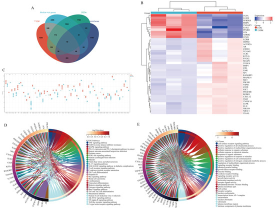 The functional enrichment analysis revealed a significant enrichment of DEGs in signaling pathways associated with diabetes and immune responses. Therefore, to identify potential hub genes, we conducted an intersection analysis among immune-related genes, T1DM-associated genes, DEGs, and module genes. Based on the Venny, a comprehensive set of 42 potential immune-related hub genes associated with T1DM liver disease was identified (Figure 4A). The heatmap visually represents the differential expression patterns of these potential hub genes across diverse populations (Figure 4B). Furthermore, boxplot analysis effectively highlights significant disparities in gene expression between each individual potential hub gene and the CON group (Figure 4C). Subsequent KEGG and GO analyses demonstrate predominant enrichment of these potential hub genes within key diabetes-associated signal transduction pathways such as TNF signaling pathway, EGFR signaling pathway, MAPK signaling pathway, PI3K-AKT signaling pathway, IL-17 signaling pathway, and AGE-RAGE signaling pathways (Figure 4D,E).
