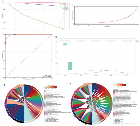 Acquisition of hub genes. (A,B) LASSO algorithm is employed to identify potential biomarkers from hub genes. (C) Receiver operating characteristic curve of predicted risk scores in T1DM liver disease. (D) Box diagram depicts the expression patterns of hub genes in each group. (E) Top 30 KEGG pathways of hub genes. (F) Top 30 GO terms of hub genes. * represents p < 0.05, ** represents p < 0.01, *** represents p < 0.005, **** represents p < 0.001.