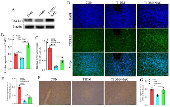 T1DM is recognized as a chronic metabolic disorder associated with autoimmunity. Through RNA-seq genomic analysis, significant alterations in the expression of CXCL12 were observed across different groups. Considering its established significance in various diseases related to T1DM, CXCL12 was selected as the subject for validation in this study. Our findings demonstrate that T1DM downregulates the expression of CXCL12, which can be effectively reversed by NAC treatment, consistent with transcriptomic analysis (Figure 6A,B) and mRNA levels (Figure 6C). Furthermore, IFA and IHC visualization of CXCL12 expression levels in liver tissues revealed a similar pattern (Figure 6E–G). Overall, our results indicate that NAC can counteract the inhibitory effect of T1DM on CXCL12, suggesting that targeting CXCL12 may play a crucial role in NAC-mediated regulation of T1DM.