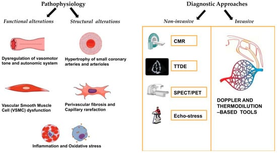 Despite its considerable impact on patient outcomes, CMD remains underdiagnosed primarily due to challenges associated with its detection. Invasive coronary reactivity testing, including the assessment of coronary physiology, remains the gold standard for diagnosing CMD [15,16]. Due to its limited availability and the potential risks associated with invasive testing, alternative noninvasive techniques such as positron emission tomography (PET), transthoracic Doppler echocardiography (TTDE), stress echocardiography [17], and cardiac magnetic resonance imaging (CMR) have been employed, although their effectiveness can vary [18] (Figure 1).