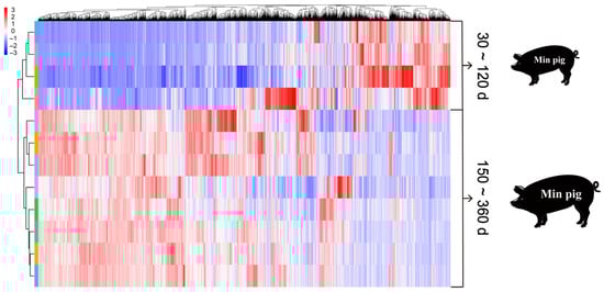 We conducted differential expression analysis on gene expression data from Min pigs across 12 different growth stages, utilizing the DEGSeq tool on the Majorbio Cloud Platform (https://cloud.majorbio.com/, accessed on 23 April 2024) [] to identify DEGs. The selection criteria were |log2Fold Change| > 1 and Q-value < 0.05, where the Q-value is the p-value adjusted by the Benjamini–Hochberg (BH) method, which better controls the false positive rate. We used the Cluster Heatmap tool on the Microbioinformatics Online website (https://www.bioinformatics.com.cn, accessed on 23 April 2024) for hierarchical clustering analysis of DEGs from Min pigs at ages 30 d to 360 d, employing the complete linkage algorithm and Euclidean distance method.