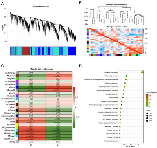 Analysis of gene co-expression modules and their functional enrichment. (A) Cluster dendrogram showing each branch as a gene and each color representing a different co-expression module. (B) Hierarchical clustering and module correlation heatmap of the modules. Different colors at the bottom represent different modules. (C) The relationship between co-expression modules and growth traits (growth stages), where the x-axis represents sample information for the two growth stages, and the y-axis represents each gene module. In the panel, the deeper the color, the higher the correlation; red indicates positive correlation, and green indicates negative correlation. The first row of data in each cell is the correlation between the module and the stage, and the second row is the significance (p-value). (D) KEGG functional enrichment of genes in key modules.