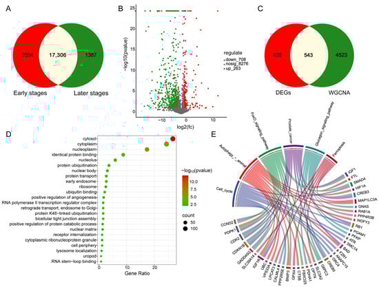 Based on the FPKM values from comparative transcriptome sequencing data, differentially expressed gene analysis was performed, identifying 17,306 shared genes between the early and late stages that were not differentially expressed (Figure 3A). Among these, 263 genes were upregulated, and 708 genes were downregulated (Figure 3B). There were 543 shared genes between the DEGs (971) between the two growth stages and the WGCNA-enriched gene set (5066) (Figure 3C). GO and KEGG enrichment analysis of the shared genes revealed that 24 GO terms were significantly enriched (p < 0.01) (Figure 3D), including 335 DEGs; 6 KEGG pathways were significantly enriched (p < 0.01), namely the FoxO signaling pathway, cell cycle, prostate cancer, autophagy—animals, ferroptosis, and glucagon signaling pathway (Figure 3E), including 40 DEGs.