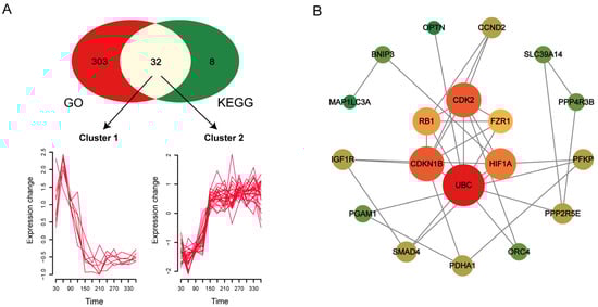 Temporal analysis and protein–protein interaction network analysis of key genes. (A) Temporal analysis of core genes. The Venn diagram above shows the intersection of genes from GO and KEGG enrichment analyses with p < 0.01 as important candidate genes, and the temporal analysis below shows the divided two clusters of intersecting genes, with the horizontal axis representing different ages and the vertical axis representing changes in relative expression levels. (B) Protein–protein interaction network diagram of the second cluster of genes from the temporal analysis, where the deeper the red, the higher the degree value, and the deeper the green, the lower the degree value.