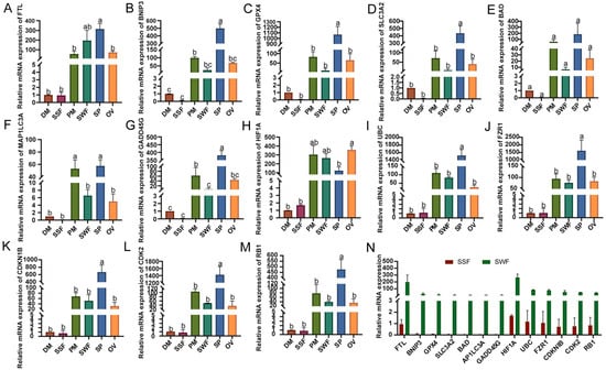 qRT-PCR results of core genes in various tissues and organs of Min pigs, where DW represents the dorsi muscle, SSF represents the subcutaneous shoulder fat, PM represents the psoas major muscle, SWF represents the subcutaneous waist fat, SP represents the spleen, and OV represents the ovary. (A–M) The qRT-PCR results for different core genes are shown, with the vertical axis representing the relative mRNA expression levels of the genes and the horizontal axis representing the different tissues and organs. (N) The expression patterns of different core genes in SSF and SWF, with the vertical axis representing the relative mRNA expression levels of the genes in these two sites and the horizontal axis representing the different genes. The significant difference analysis was conducted using the letter marking method.