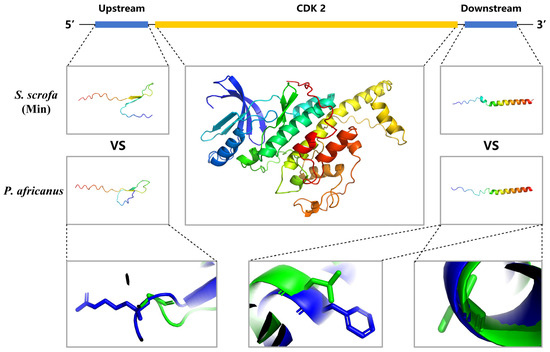 CDK2 gene structure and three-dimensional protein structure simulation of the CDK2 gene in Min pigs and P. africanus. In the three detailed figures below, the first detail figure illustrates the differences in amino acid structures in the upstream non-coding protein sequences of the CDK2 gene between Min pigs and P. africanus, while the second and third detail figures show the differences in amino acid structures in the downstream non-coding protein sequences of the CDK2 gene between Min pigs and P. africanus, with blue representing Min pigs and green representing P. africanus.