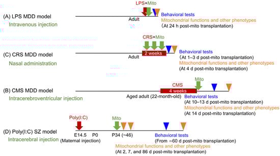 Experimental protocols for mitochondrial transplantation in animal models of psychiatric disorders. The red arrows or boxes indicate the time points of psychiatric disorder model treatments, the green arrows indicate the time points of mitochondrial transplantation, the blue arrowheads indicate the time points of behavioral tests, and the orange arrowheads indicate the time points of the analysis of mitochondrial functions and other phenotypes. LPS: Lipopolysaccharide; MDD: major depressive disorder; CRS: chronic restraint stress; CMS: chronic mild stress; Mito: mitochondria.