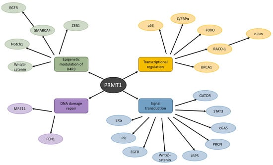 Proper management of signal transduction and molecular networks is pivotal for cell growth and survival. These molecular signaling pathways are often disrupted in cancer cells, allowing them to proliferate rapidly and uncontrollably [57]. An abundance of research has reported that many different signaling pathways in cancer cells are dysregulated due to PRMT1-mediated methylation (Figure 2).