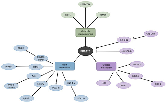 PRMT1 is not only required for the overall maintenance of β-cells in the pancreas but is also involved in the control of specific β-cell functions. More specifically, protein methylation by PRMT1 has been suggested to act as a mediator of insulin secretion [101]. When PRMT1 expression is elevated, insulin secretion and content are low. The mechanism behind this appears to be that PRMT1 controls the intracellular translocation of FOXO1 and PDX-1 and reduces FOXO1 methylation. In other words, high PRMT1 expression decreases glucose-stimulated insulin secretion, resulting in reduced intracellular insulin levels. Moreover, FOXO1 overexpression, caused by PRMT1 methylation, impairs the function of β-cells.