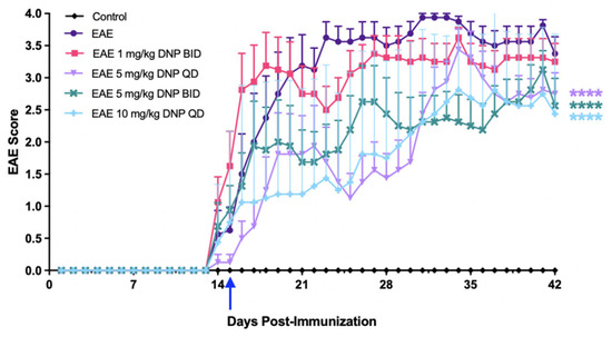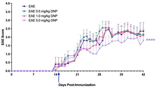 Dose-effects of 0–5.0 mg/kg DNP on EAE scores. DNP was orally administered daily beginning on day 15 (blue arrow) at the indicated doses, and animals were scored for clinical signs of EAE ascending paralysis. Differences among groups of animals were analyzed using a repeated measures one-way ANOVA with Tukey’s multiple comparison test. Mice receiving 5.0 mg/kg DNP had significantly lower EAE scores than mice receiving no DNP (EAE = EAE mice sham-treated with PBS only). **** p < 0.0001 (n = 10 mice/treatment).