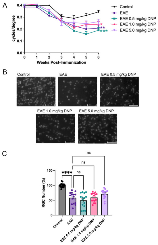 Visual function was assessed using OKR. As shown in Figure 5A, OKR scores in PBS-treated EAE mice were significantly reduced compared to control (sham-immunized non-EAE) mice. Similarly, OKR scores of DNP-treated EAE mice were significantly decreased compared to untreated control mice. DNP treatment at any dose did not result in a significant increase in visual function compared to PBS-treated EAE mice (Figure 5A).