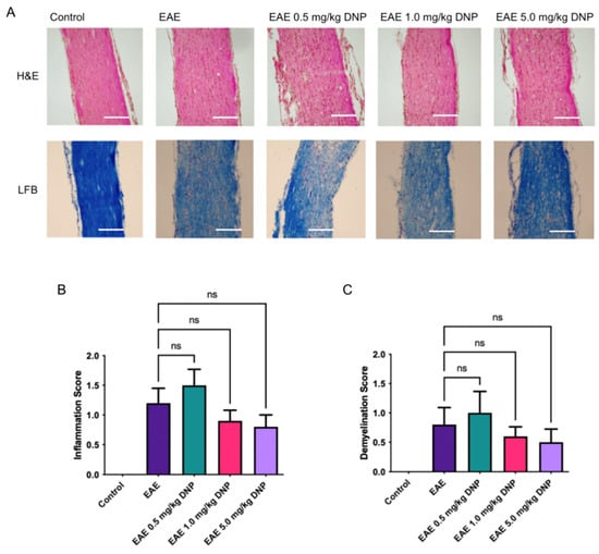 To determine the effects of DNP on optic nerve inflammation and demyelination, optic nerve sections were stained with H&E and LFB. Representative images shown in Figure 3A were taken from all mouse groups and uniformly enhanced to illustrate the aspects which were used by the masked investigator for evaluation. As shown in Figure 3B,C, DNP treatment had no significant effect on either inflammation or demyelination compared to the PBS-treated EAE mice.