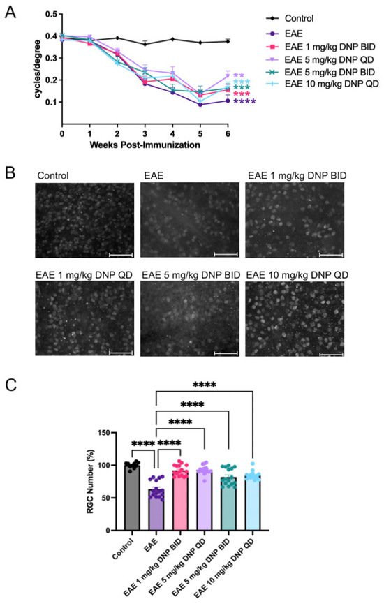 DNP was dissolved in PBS and administered through oral gavage while control mice received PBS alone. EAE mice were treated by oral gavage once daily (QD) or twice daily (BID) with 0.5, 1.0, 5.0, or 10 mg/kg DNP as indicated, starting from day 15 post immunization until sacrifice (day 42). DNP treatment was administered in two experiments. In the first experiment (Figure 1, Figure 2 and Figure 3), 10 control mice were sham-treated with PBS, and 4 groups of 10 EAE mice/group received once daily 0 (PBS only), 0.5, 1.0, or 5.0 mg/kg DNP. All 20 eyes/treatment group were assessed for OKR responses. Five eyes/group from 5 different mice were randomly pre-selected for protein extraction studies prior to study initiation, and the remaining 15 eyes were used for RGC quantification. In the second experiment (Figure 4, Figure 5 and Figure 6), 8 control mice were sham-treated with PBS, and 5 groups of 8 EAE mice/group received either 0 (PBS only), 5.0, or 10.0 mg/kg DNP daily, or 1.0 or 5.0 DNP twice daily. All 16 eyes were assessed for OKR responses and RGC quantification.