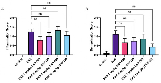 Effects of DNP in high doses on optic nerve inflammation and demyelination. (A) Inflammation scores following oral administration of DNP in high doses. (B) Demyelination scores following oral administration of DNP in high doses. DNP treatment, at any dose or frequency, did not significantly impact inflammation or demyelination. ns = non-significant.