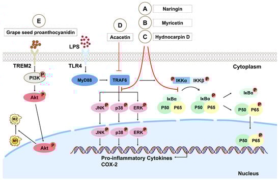 Regulatory mechanism of flavonoids on macrophages in LPS stimulation. (A–C) Naringin, myricetin, and hydnocarpin D attenuate the activation of the NF-κB and MAPK signal pathways by inhibiting the degradation of IκBα, nuclear translocation of NF-κB p65, and phosphorylation of ERK, JNK, and p38 in macrophages, thus blocking the expression of inflammatory factors in macrophages. (D) Acacetin can inhibit the TRAF6/NF-κB/COX-2 signal pathway. (E) The activation of TREM2 by binding to grape seed proanthocyanidin can promote the phosphorylation of the PI3K/Akt signal pathway downstream and regulate the polarization of macrophages from M1 to M2. Akt: protein kinase B; COX-2: cyclooxygenase-2; ERK: extracellular signal-regulated kinase; Ikkα/β: nuclear factor κB kinase α/β; IκB: inhibitor of NF-κB; JNK: c-Jun N-terminal kinases; MAPK: mitogen-activated protein kinase; MyD88: myeloid differentiation factor-88; NF-κB: nuclear factor-κB; PI3K: phosphoinositide 3-kinase; TRAF: TNF receptor-associated factor; TLR4: toll-like receptor 4; TRAF6: TNF receptor-associated factor 6; TREM2: triggering receptor expressed on myeloid cells 2.