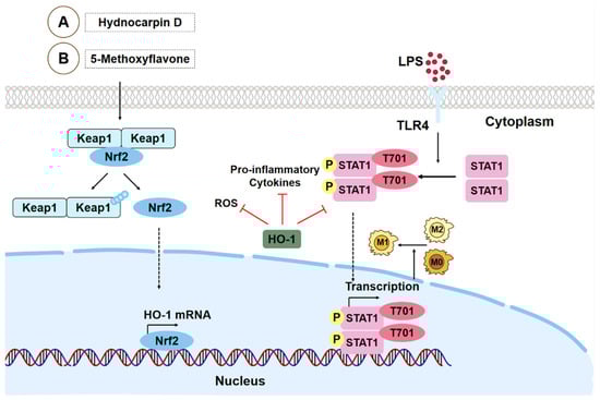 Effects of hydnocarpin D and 5-methoxyflavone on macrophages in LPS stimulation. (A,B) Hydnocarpin D can increase the expression of antioxidant factors Nrf2 and HO-1 and reduce the expression of its negative regulatory factor Keap1, thus inhibiting the inflammatory response and oxidative stress caused by macrophages. 5-Methoxyflavone inhibits the activation of STAT1 signal by activating the Nrf2/HO-1 signal pathway in macrophages and, finally, reverses the polarization of M1 macrophages and the repolarization of M2 macrophages to M1. HO-1: heme oxygenase-1; Keap1: kelch-like ECH-associated protein 1; Nrf2: nuclear factor erythroid 2-related factor 2; ROS: reactive oxygen species; STAT1: signal transducer and activator of transcription-1.