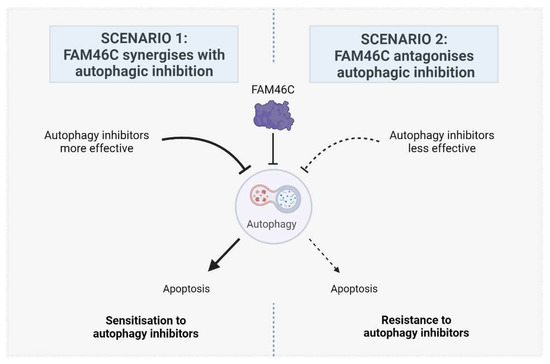 Proposed models describing the possible effects of FAM46C expression on the efficacy of cancer treatment with autophagy inhibitors. In scenario 1, FAM46C is expected to synergise with autophagic inhibition, rendering cells more sensitive to the administration of autophagy inhibitors. In scenario 2, FAM46C is expected to antagonise autophagic inhibition, rendering cells less sensitive to the administration of autophagy inhibitors. Image created with BioRender.com.