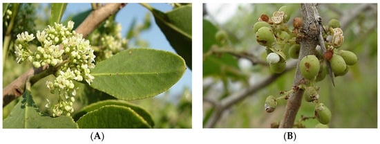 Maytenus senegalensis leaves and flower (A), and bark and fruits (B), courtesy of https://pza.sanbi.org/gymnosporia-senegalensis (accessed on the 26 September 2024).
