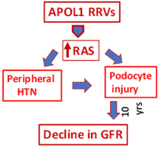 Activation of the Renin–Angiotensin System (RAS) in an escalated APOL1RRV milieu increased peripheral blood pressure and induced podocyte injury of the same type. However, a decline in GFR took 10 years to manifest. Renin–Angiotensin System (RAS).
