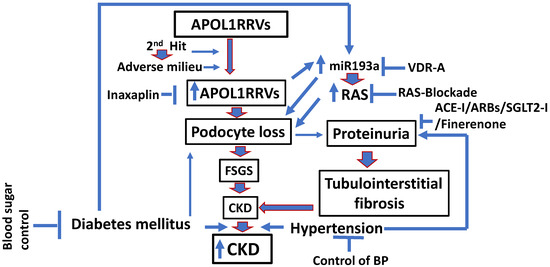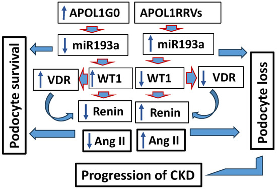 APOL1G0 negatively regulates miR193a expression in podocytes [46], but the APOL1–miR193a axis is disabled in the context of APOL1 risk variants; conversely, APOL1 variants enhance the expression of miR193a [47], which is a driver of podocyte loss through the inhibition of WT1 [50] and activation of the RAS by attenuating the expression of VDR [38]; the latter negatively regulates the generation of renin [59,60]. Loss of podocytes causes a decrease in GFR and proteinuria, thus initiating tubular interstitial fibrosis and its further progression (Figure 5) [61,62]. Decreased GFR, proteinuria, and the progression of tubular intestinal fibrosis are hallmarks of CKD. Since glomerular hypertension is mediated predominantly through the activation of the local RAS, its downregulation significantly reduces proteinuria. On that account, strategies to slow the progression of CKD, particularly those that aim to decrease proteinuria, prominently include RAS blockade.