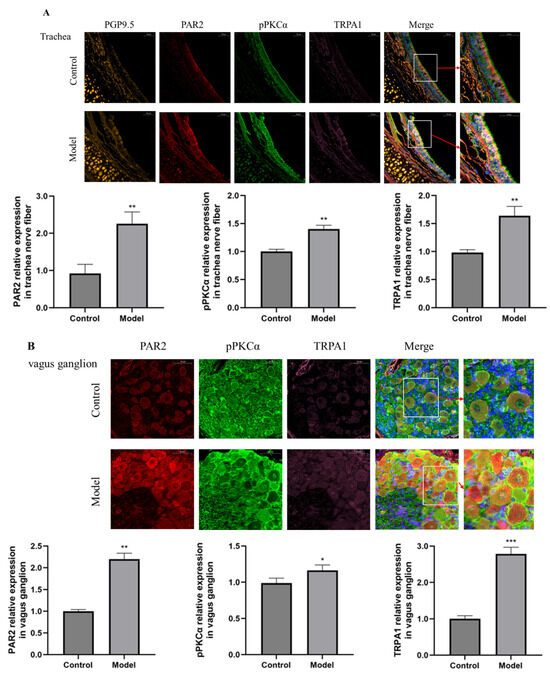 Immunofluorescence was used to detect the expression of PAR2 (red fluorescence), pPKCα (green fluorescence), TRPA1 (pink fluorescence) and PGP9.5 in nerve fibers (orange fluorescence) in the trachea and vagus ganglion (scale = 50 μm). (A) The expression of PAR2, pPKCα and TRPA1 in the trachea was greater in the citric acid-induced enhanced cough group than in control guinea pigs. (B) The expression levels of PAR2, pPKCα and TRPA1 in the vagus ganglion were greater in cough group than in control guinea pigs. The results are expressed as the means ± standard deviations (vs. the control group: * p < 0.05, ** p < 0.01, *** p < 0.001).