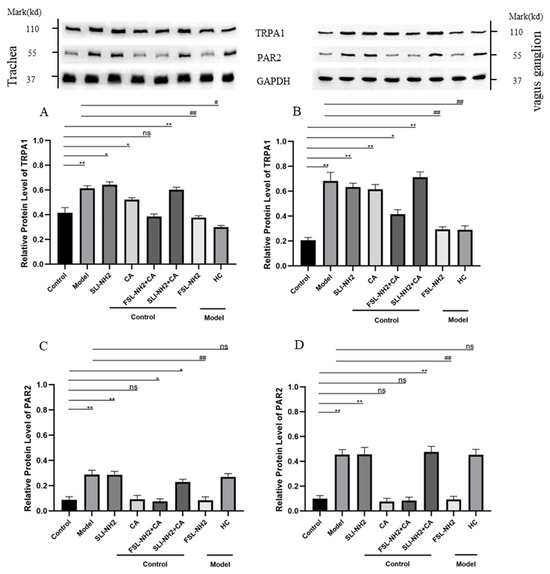 The effects of the PAR2, TRPA1agonist/antagonist on the expression of PAR2 and TRPA1 in nerve fibers in the trachea and the vagus ganglion of guinea pigs were evaluated. (A) The expression of TRPA1 in the nerve fibers of the trachea was increased in the citric acid-induced enhanced cough group after drug treatment. Activation of PAR2 upregulated TRPA1 expression, whereas inhibition of PAR2 in cough group suppressed TRPA1 expression. (B) The expression of TRPA1 in the vagus ganglion after drug treatment tended to be similar to that in (A). (C) The expression of PAR2 in the nerve fibers of the trachea was increased in the cough group after drug treatment, whereas TRPA1 receptor activation/inhibition had no effect on PAR2 expression. (D) The expression of PAR2 in the vagus ganglion after drug treatment tended to be consistent with that in (C). PAR2 agonist SLIGRL-NH2 (SLI-NH2 200 µg/kg), TRPA1 agonist cinnamaldehyde (CA 5 mg/kg), PAR2 antagonist FSLLRY-NH2 (FSL-NH2 200 µg/kg), TRPA1 antagonist HC-030031 (HC 200 µg/kg). The results are presented as means ± standard deviations (vs. the control group: * p < 0.05, ** p < 0.01; vs. the cough model group: # p < 0.05, ## p < 0.01; ns: p > 0.05).